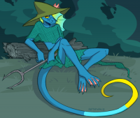 A tall, slender, anthropomorphic basilisk lizard with light blue skin, a very long tail which fades to yellow at the tip, and a drooping head fin that starts yellow at the base and fades to turquoise at the outer edges. Always wears a wide-brimmed moss green hat with a pink flower pinned to it, and prefers loose-fitting clothing in varying shades of green with a skirt of some manner, generally made of waterproof materials. Never wears shoes, both because they're awkward with her webbed flipper feet and because they tend to be uncomfortable when wet. She also wears a ring in her left nostril.
