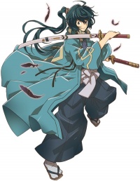 A young man appearing in his late teens but possessing a boyish charm, usually bearing a cheerful disposition. His long dark hair is worn up in a topknot with longish bangs that frame his face and threaten to fall into his dark blue eyes. At a glance he appears to be dressed in traditional Japanese wear consisting of a kimono, hakama and a haori, all in tones of gray-blue to sky blue, with pale yellow trim for the designs on his haori. Around his neck is something of a scarf tucked into the neck of his kimono. His footwear consists of tabi socks and zori-slippers.