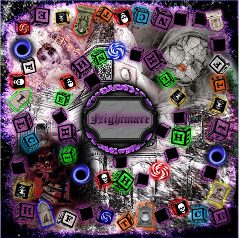 I'm just think of different things, I dunno. Up to you. I figure the gold boxes with the jack in the box can be your treasure or trap cards, the red skull can be the Curse cards and the lollypop blocks can transport players to the inside and vice versa.